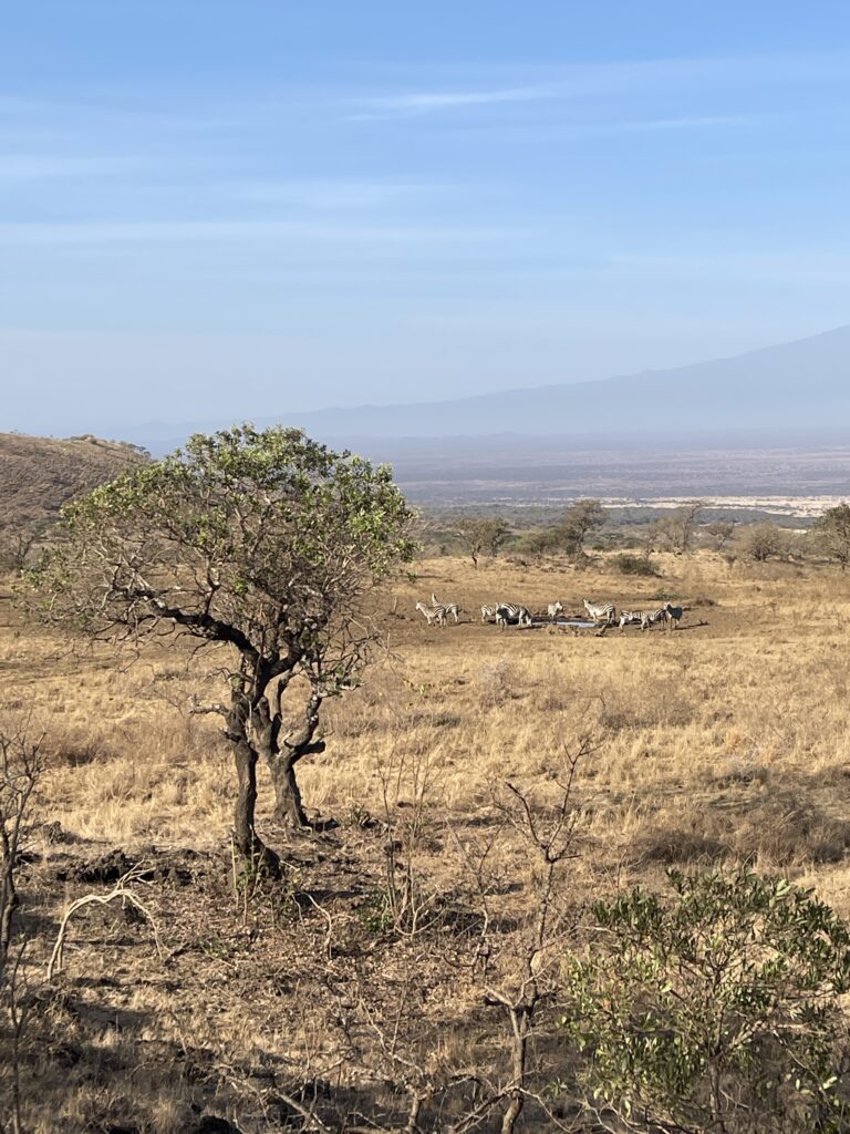 Camp Kanzi was dream-like, a safari film-set. Intimate, unapologetically lavish, and profoundly rooted in the Maasai soul. Only five of us for our two-night idyll: Victoria and I, plus a trio of discerning Americans whose whispers hinted at boardrooms in Manhattan and ranches in Montana. Our private suites were tented masterpieces, elevated on platforms beneath thatched roofs woven from rare Chyulu Hills grasses. Mine was a cinematic reverie: billowing white linens on a kingly four-poster carved from fallen ebony, brass fixtures, and a shower that fed the watering hole, visible from my veranda, a private view, like the front-row seat at the circus: impala, troops of baboons, iridescent blue starlings darting like sapphire arrows, lizards, giraffes nonchalantly passing by, humorous warthogs scurrying past the lumbering water buffalo, and herds of zebra.